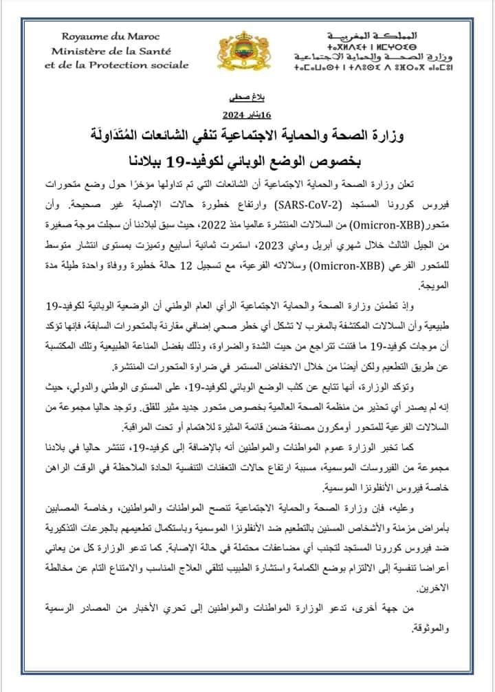 أعلنت وزارة الصحة والحماية الاجتماعية بلاغا بخصوص ما تم تداوله حول عودة موجة كورونا وهذا نص البلاغ: