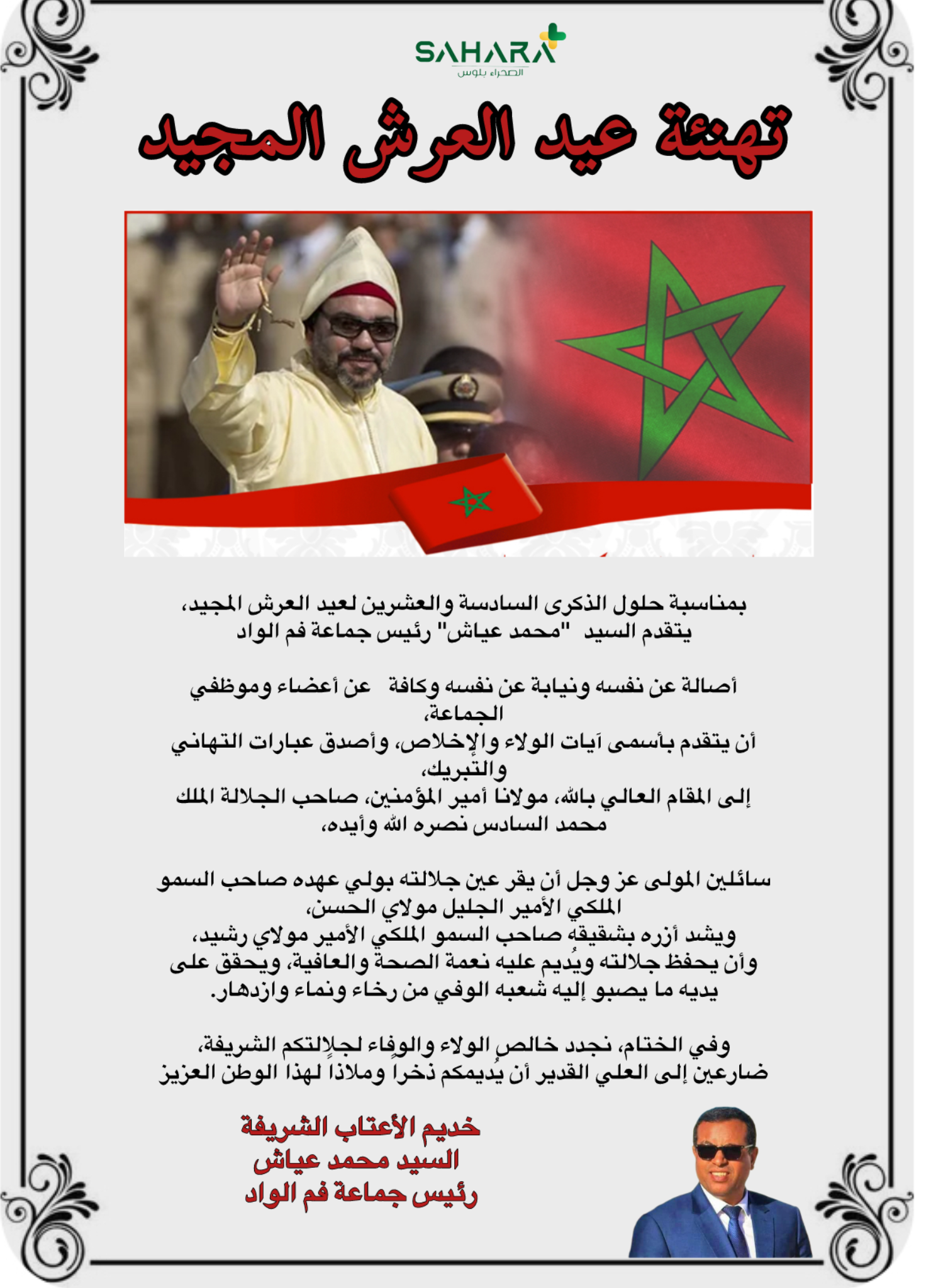 السيد محمد عياش رئيس جماعة فم الواد يهنئ جلالة الملك بمناسبة ذكرى عيد العرش المجيد
