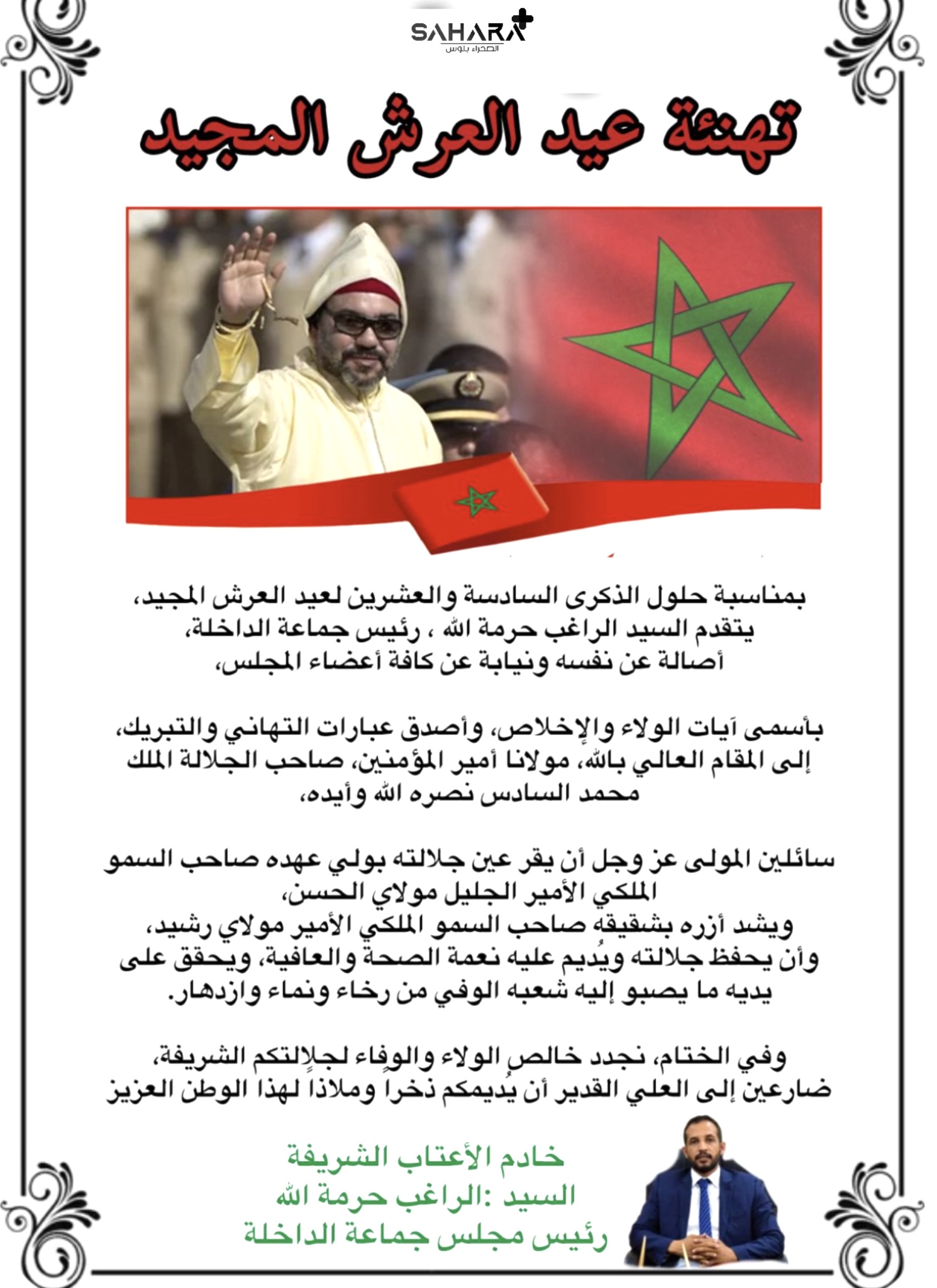 رئيس مجلس جماعة الداخلة يهنئ صاحب الجلالة الملك محمد السادس بمناسبة الذكرى السادسة والعشرين لعيد العرش المجيد