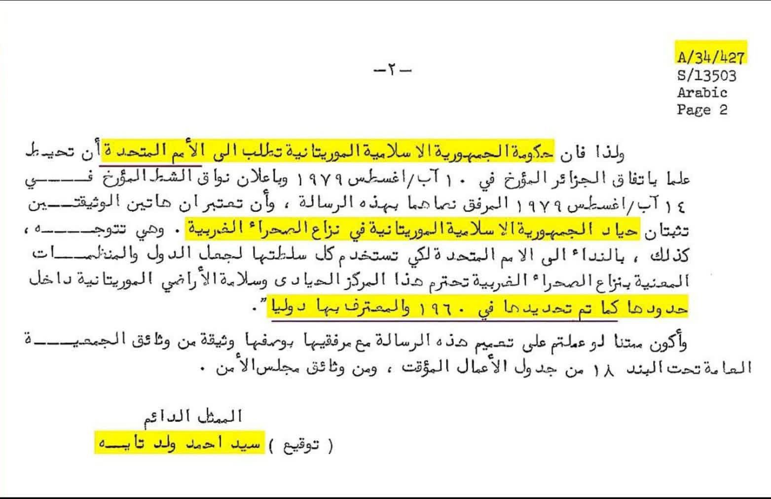 وتضمنت الوثيقة، التي تحمل رقم A/34/427، مراسلة رسمية من حكومة الجمهورية الإسلامية الموريتانية إلى الأمين العام للأمم المتحدة، تؤكد فيها نواكشوط انسحابها من الإقليم وإعلان حيادها التام إزاء النزاع القائم حول الصحراء؛ كما شدد ممثل موريتانيا الدائم لدى الأمم المتحدة آنذاك، سيد أحمد ولد تايه، على أن بلاده لم تعد طرفا في النزاع، وأن موقفها يقوم على عدم الانحياز والدعوة إلى تسوية سلمية في إطار الشرعية الدولية.